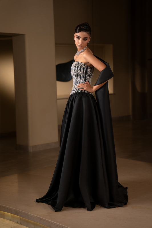 The collection is inspired by the idea of clean structure, visible craftsmanship, and clarity in design. Each dress is created through artisanal handwork, where every crystal, sequin, bead, and marquise stone is individually hand-stitched into the fabric — never glued, never pre-made, never surface-added. The silhouettes you see are constructed and embellished simultaneously, layer by layer, with meticulous attention to structure and flow.