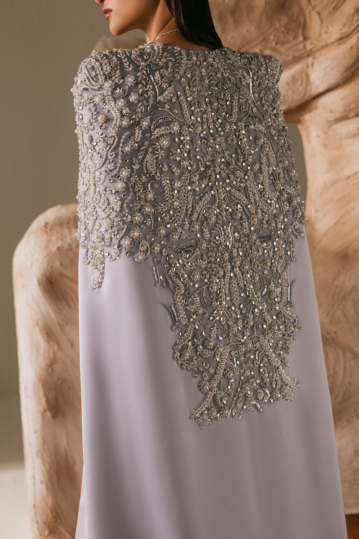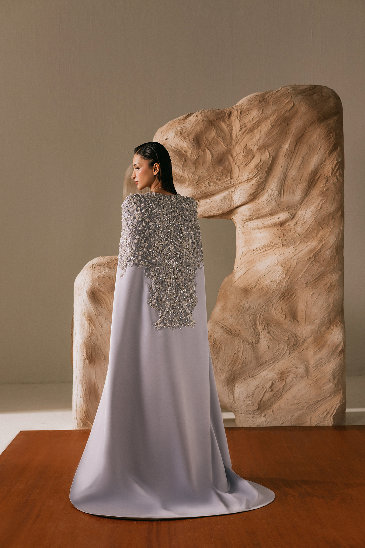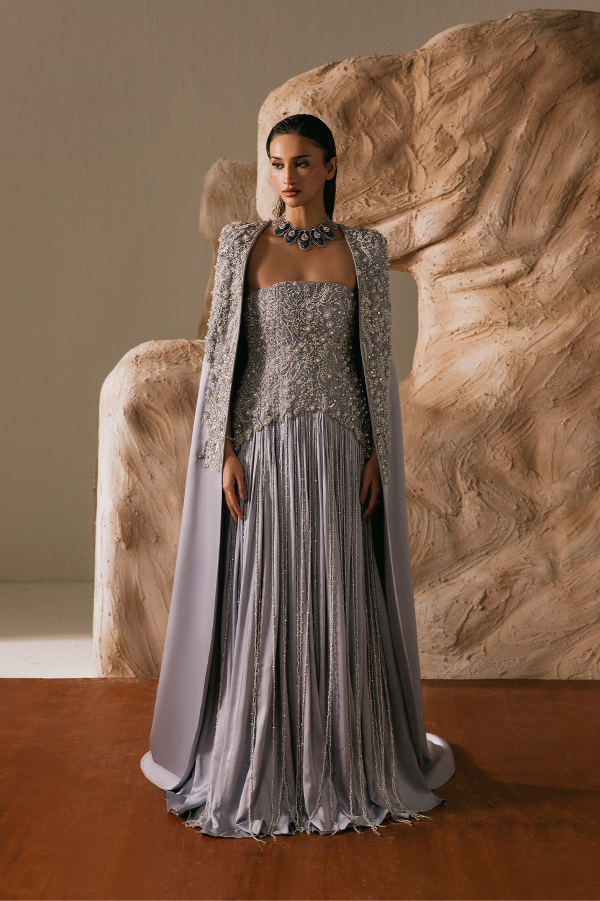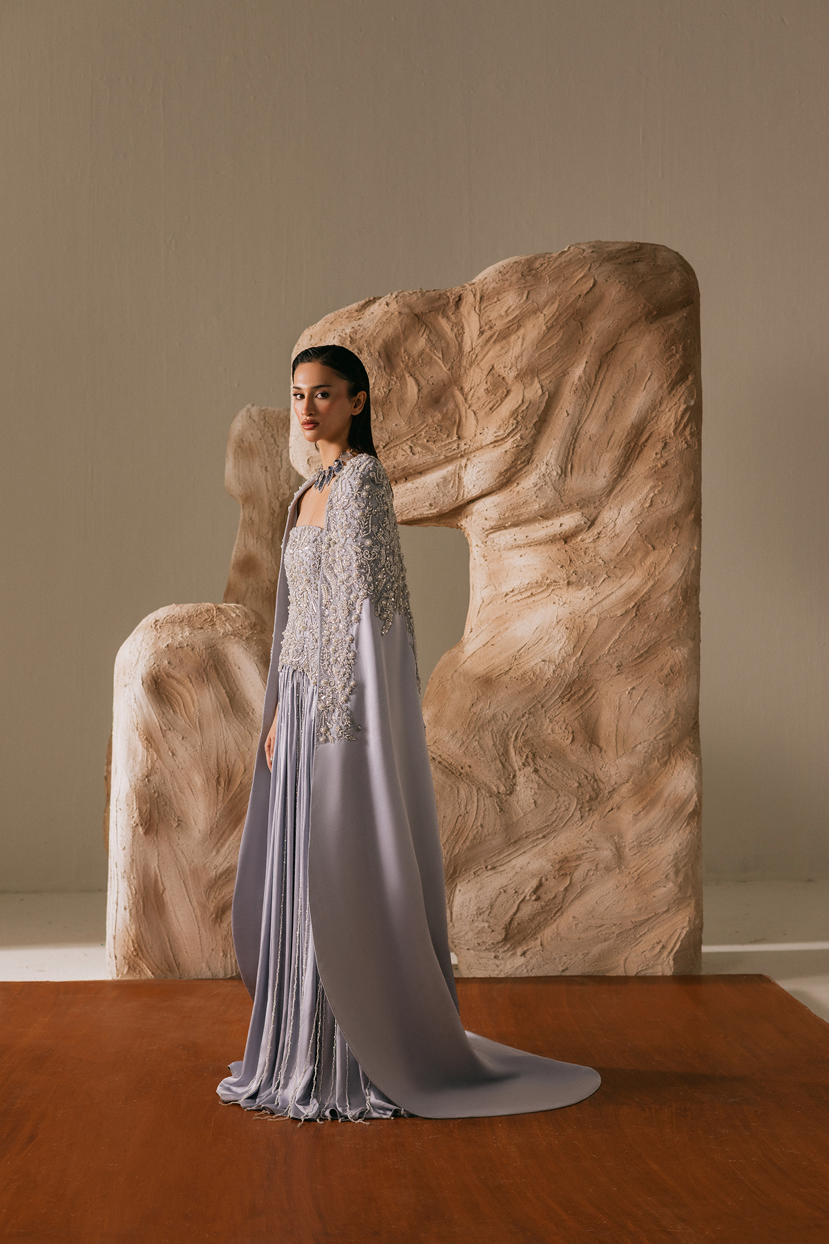 Cascading fringes and beadwork meets a long, dramatic cape that trails behind. Every step animates the crystals and threads, turning movement into a statement of couture drama and precision.