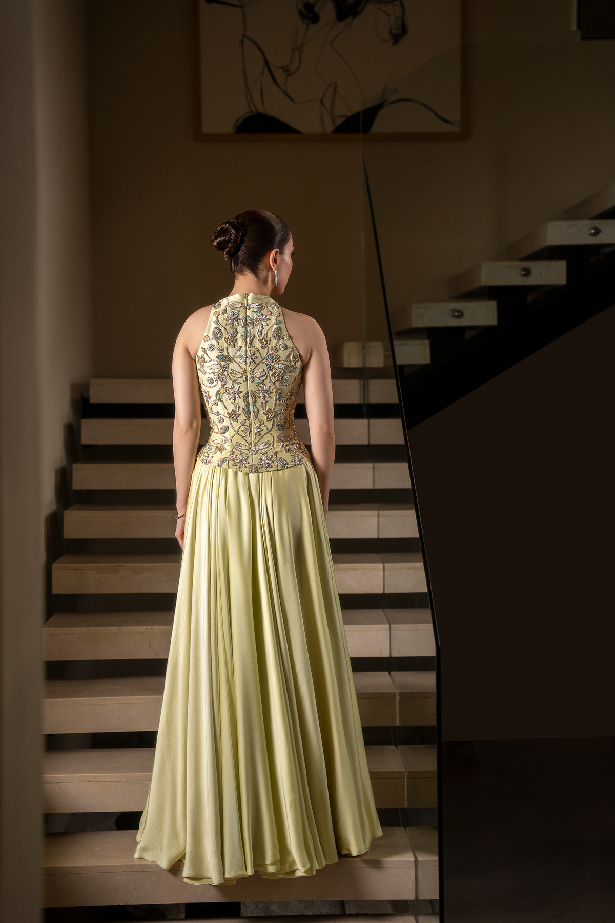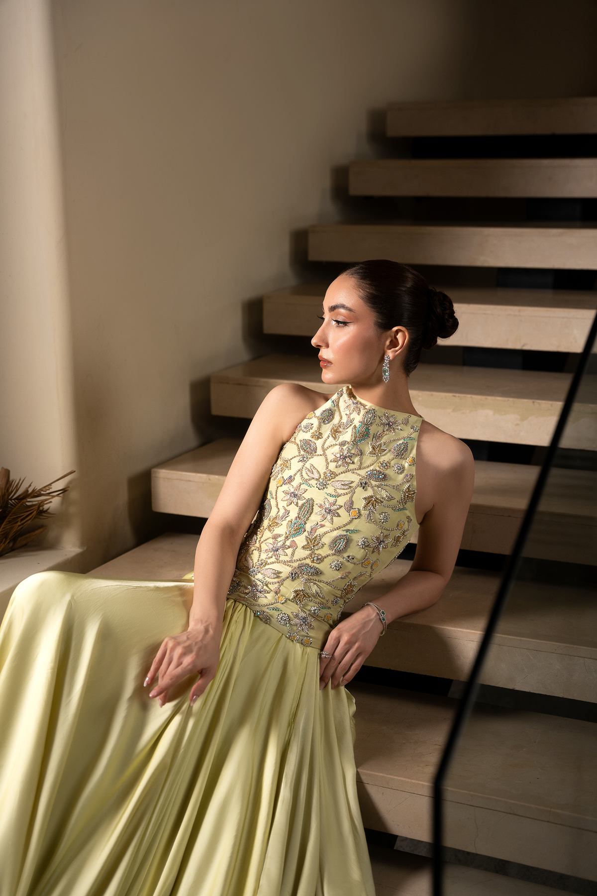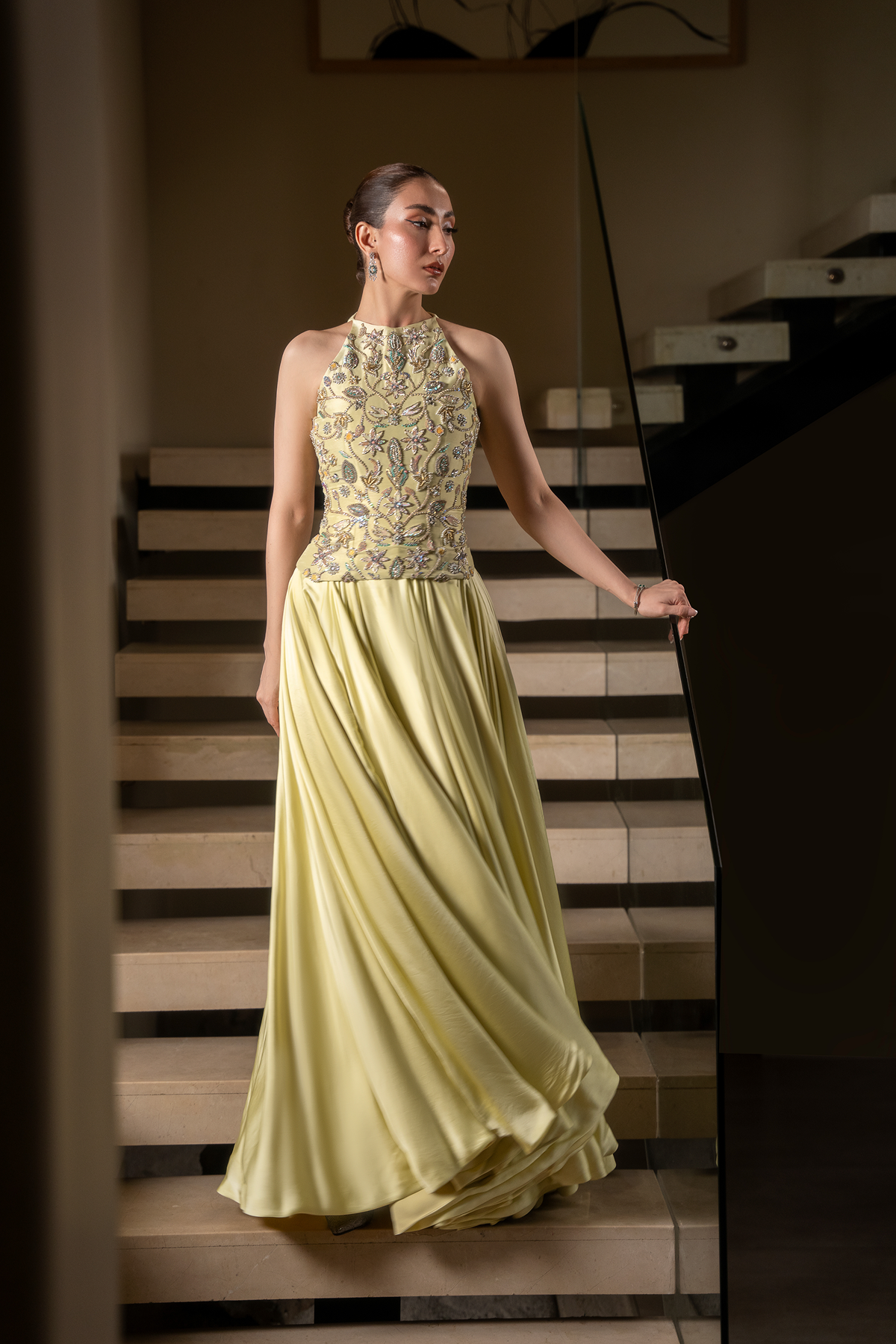 Elara – a radiant pastel‑yellow gown that captures light in every thread. The halter neckline shines with intricate multicolored hand‑bead work, while the flowing satin skirt sweeps gracefully, embodying sheer elegance.