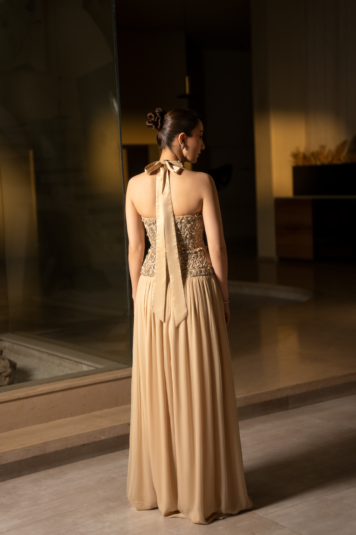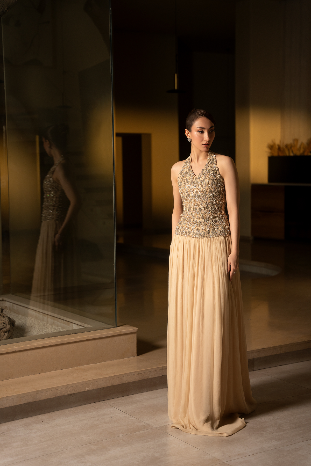 A symphony of restraint and opulence. A champagne-toned lattice of hand-worked crystals, pearls and bullion coils sits over a weightless chiffon fall. Designed to shimmer softly, move gracefully, and make the simplest moment feel like an entrance.
