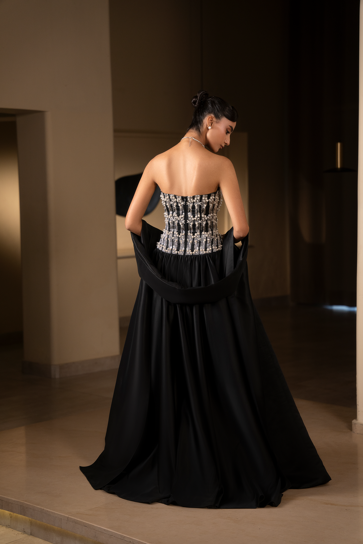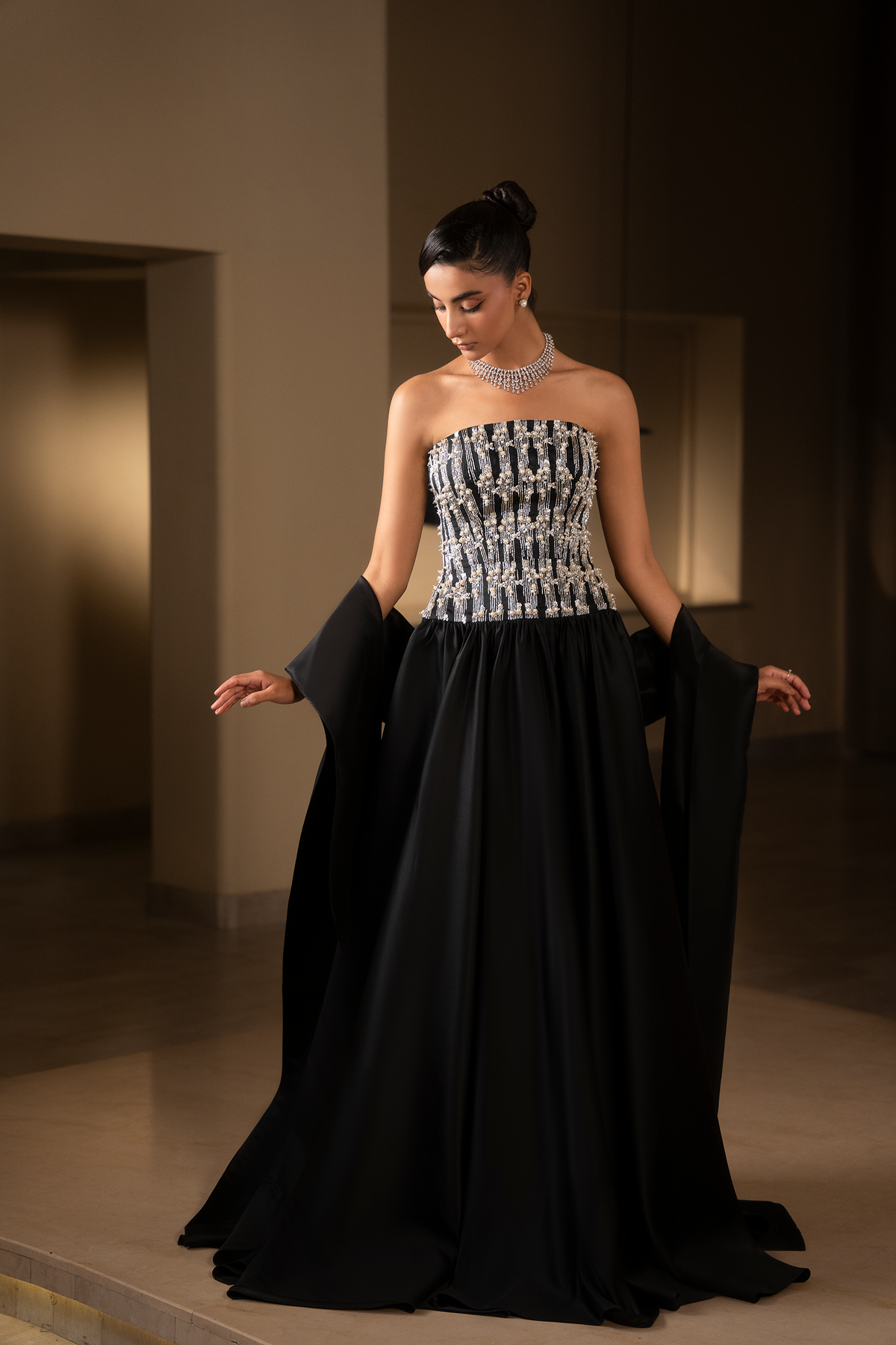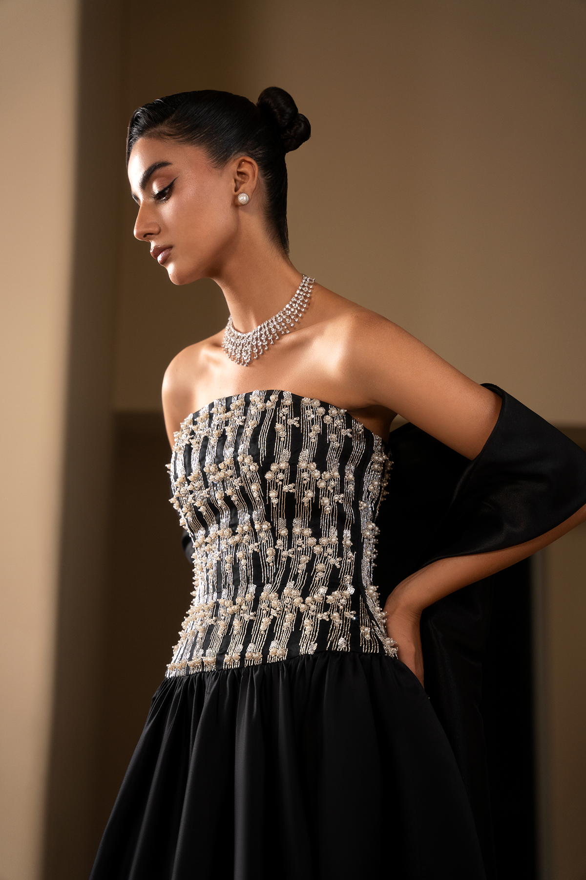 Hand-crafted using a blend of bullion wire, pearls and flat back rhinestones. Each element is individually threaded and positioned to create a controlled vertical grid that reinforces the silhouette.